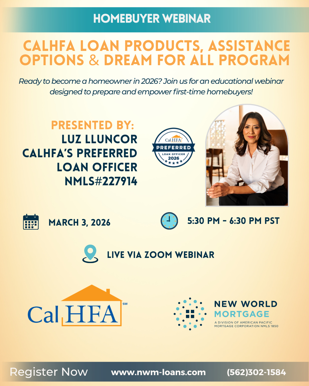 The webinar will be presented by Luz Lluncor, CalHFA Preferred Loan Officer, who will provide expert insight and answer your most important questions about the process.